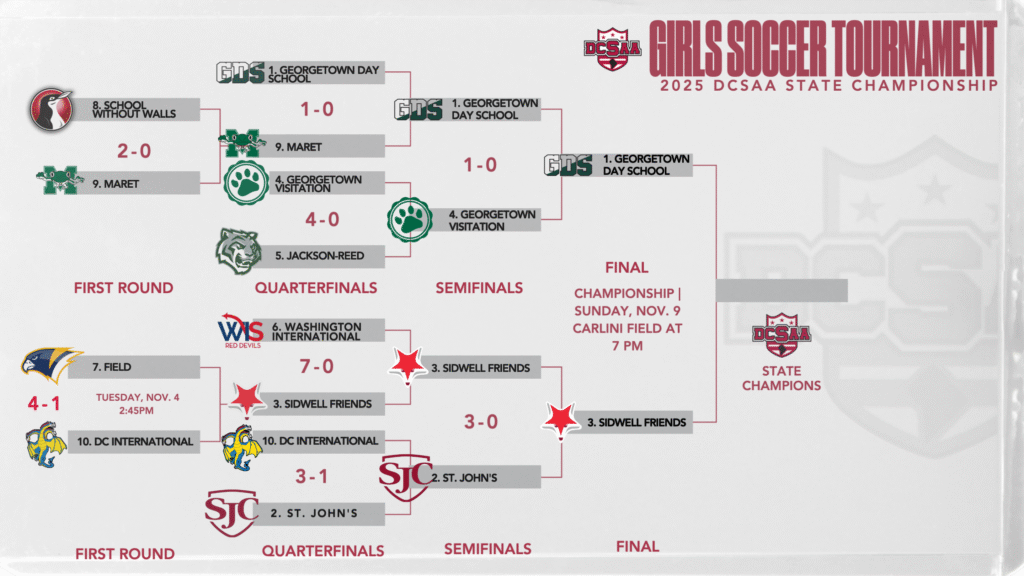 The 2025 DCSAA Girls Soccer State Championship between Georgetown Day School (GDS) and Sidwell Friends School (SFS) will resume today, Monday, November 10th, at 4:00 PM at Catholic University’s Carlini Field.